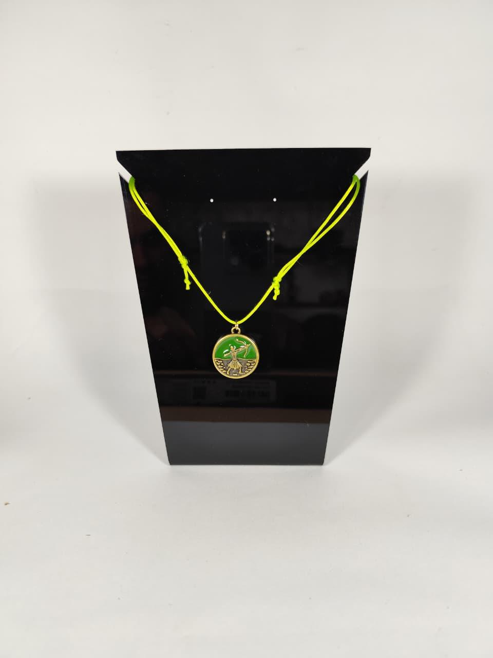 Confeccionado em cordone verde vibrante — cor que simboliza a cura, a natureza e a renovação —, este fio é leve, resistente e extremamente confortável para o uso diário. O elemento central é o medalhão dourado resinado, que apresenta a imagem detalhada da Orixá com seu arco e flecha (Ofá), protegida por uma camada de resina que preserva o brilho e a imagem sagrada.