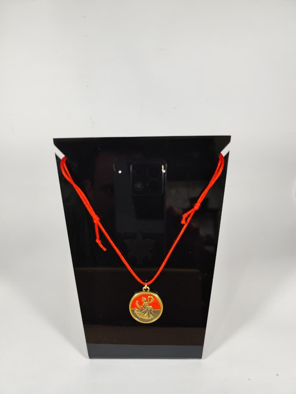 Confeccionado em cordone vermelho de alta resistência, este fio é leve e confortável para o uso diário. O elemento central é o medalhão dourado resinado, que apresenta a imagem detalhada da Guardiã. A camada de resina protege o símbolo sagrado, garantindo que o brilho e a imagem permaneçam impecáveis por muito mais tempo.